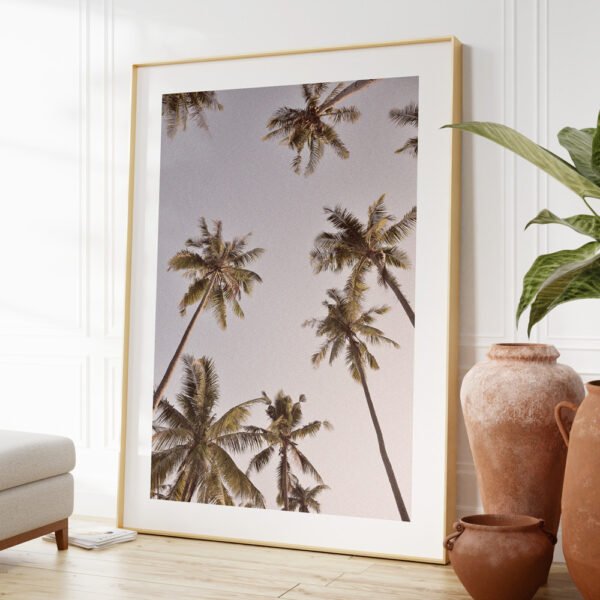 Na tym plakacie dominują palmy, ich wysokie i giętkie pnie sięgają ku niebu, wznosząc się ponad otoczenie. Ich liście są wspaniale rozłożone i przypominają delikatne wachlarze, które tańczą na wietrze. Stanowią przepiękne tło dla nieba, podkreślając kontrast pomiędzy zielenią i błękitem. Plakat ten jest częścią kolekcji „Palm Springs”.