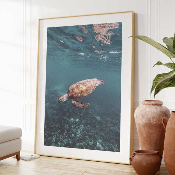 Plakat z żółwiem morskim pod wodą przynosi poczucie spokoju, piękna i bliskości z naturą. To hołd dla tych wspaniałych stworzeń i ich podwodnego środowiska. Obraz ukazuje wspaniałą symbiozę życia morskiego, która inspiruje do troski o oceany i ich ochrony.
